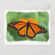 A beautiful monarch butterfly with its wings spread, has landed on a tithonia blossom. The soft green background makes the image "pop".