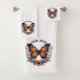 Add a touch of natural beauty to your bathroom with this exquisite bath towel set, featuring a bath towel, hand towel, and washcloth. Each piece showcases the intricate design of a monarch butterfly in vibrant shades of orange and black, surrounded by a lively floral arrangement of red, orange, blue, and green hues. This delicate and artistic motif brings the enchanting charm of nature into your home, making it a perfect choice for both everyday use and as a thoughtful gift.