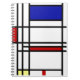 Mondrian Modern Art notebook has a section like Composition 10 by Pieter Piet Mondrian in red , blue , yellow , black and white , the most well know of the De Stijl art movement group that used three primary colours with black lines on a white background