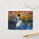 Postcard featuring Claude Monet’s oil painting Camille Monet and a Child in the Artist’s Garden in Argenteuil (1875). A woman and kid dressed in blue sew and read in a garden of red and white flowers. A great Monet gift for fans of impressionism and French art.