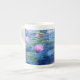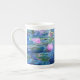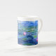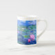 A Monet pink water lilies bone china mug featuring beautiful pink water lilies floating in a calm blue pond with lily pads. A great Monet gift for fans of impressionism and French art. Serene nature impressionism with lovely flowers and scenic pond landscape.