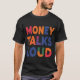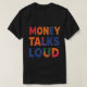 A colourful t-shirt design with the bold statement "Money Talks Loud" in a vibrant, multicolored font.