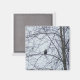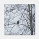 A photograph of a Bald Eagle perched on a tree branch surveying the area. The image was created in winter. The leaves have left the trees and the branches are gathering lumps of snow. A few specks of snowflakes fall over the back of the eagle's feathers. The sky is cloud cover.
