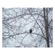 A photograph of a Bald Eagle perched on a tree branch surveying the area. The image was created in winter. The leaves have left the trees and the branches are gathering lumps of snow. A few specks of snowflakes fall over the back of the eagle's feathers. The sky is cloud cover.