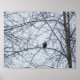 A photograph of a Bald Eagle perched on a tree branch surveying the area. The image was created in winter. The leaves have left the trees and the branches are gathering lumps of snow. A few specks of snowflakes fall over the back of the eagle's feathers. The sky is cloud cover.