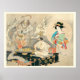 High quality, high resolution Japanese print depicting a monk concealing a knife behind his back while he calmly confronts a demon. Possible lover watches in the corner. Very interesting.
