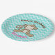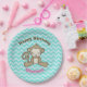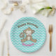 A cute jungle / safari themed happy birthday personalised paper plate. Set on a blue chevron background. A cute cartoon illustration of a sweet brown monkey sitting down. She has pink blushing cheeks for additional