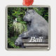 Travel to Bali, Indonesia's famous Hindu island, and you must visit the town of Ubud, which is home to the Sacred Monkey Forest. The grey stone image of a mother long-tailed macaque monkey sits atop a pillar at the entrance, with her stone baby monkeys playing around her feet and below her on the pillar. A stone tail from one of the juvenile monkeys shows around the corner of the pillar in the lower right corner. A green, leafy background is made up of trees and fern fronds. Photo copyright Gail Storrs 2006.