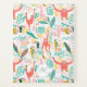 This seamless pattern features playful jungle animals in pastel colours. We can see several monkey orangutan in coral orange, eating bananas, next to toucans, cockatoo, snakes and sloth. All surrounded with bright tropical leaves in green, pink, yellow and orange tones.