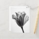 A close-up, monochrome photograph showcases a tulip flower against a bright white background. The flower's petals are delicately rendered, with visible veins adding texture. The image captures the flower from a low angle, emphasizing its upward reach. The stem is slender and dark, contrasting with the lighter petals. The overall mood is serene and elegant, highlighting the flower's natural beauty.
