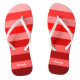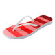 A pair of flip flops with a cool monochrome shades of red colour block stripes pattern design and a customizeable name print in white letters.