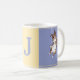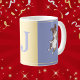 Personalise this mug with your own initial, your dog's, or someone else's initial to then give it as a gift. This is a fun, colour block mug featuring a yellow square in between two blueish-purple squares with small lines at the top and bottom (either yellow or white depending on what colour square it is crossing). On either side of the mug is an illustration of an Aussie jumping in the air. In the middle (in the yellow square) is a spot for you to customise with an initial. This makes for a great, custom gift for any dog lover or Australian shepherd owner. It will be a nice, bright, and cheerful addition to your kitchen.
