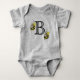 Baby suit features a bold letter B monogram, adorned by black and yellow bumblebees. Great for any baby with a 'B' name!