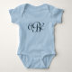 Monogram baby shirt in blue with navy blue monogram and script fonts.