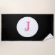 The monogram beach towel is a classy design with solid black background and large white circle in the middle of beach towel. The monogram is in the centre of the white circle. You can change the colour of towel and monogram letter if you'd like.