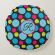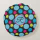 A colourful pattern of blue and hot pink dots on a black background on this monogrammed throw pillow. Customise with your initial using the "personalise" option.