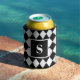 Custom monogrammed bold black and white harlequin diamond-patterned can cooler.