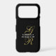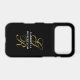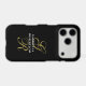 Elegant refined premium look chic iPhone case, personalizable customisable with monogram, initial letters and name. Classy timeless black background, elegant gold calligraphy script handwritten initial letters, and stylish white typography for the name. Beautiful, neutral monochromatic, minimalist minimal simple and useful, for protecting your cellphone or as a thoughtful custom electronic tech accessory gift for her, under 30 dollars For personal use or as a professional business phone case. Suitable as a birthday, Mother’s Day, Christmas, graduation, even retirement present. Or for your company employees for example.
