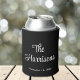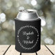 Black monogram wedding can cooler party favour with your married last name in a stylish white script on one side, and your first names inside a heart wreath on the other side.