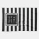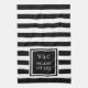 Elegant personalised initials monogram kitchen towel featuring a black and white striped pattern with your initials and family name with your established date set in a black-bordered square with a classic white text. Designed by Thisisnotme©