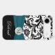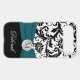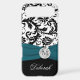 Monogrammed modern black and white floral damask pattern Case-Mate Vibe™ iPhone 6 Plus Case with teal blue PRINTED ribbon and PRINTED faux engraved look crystal brooch. Customise it to add your name, initial, or other text. If you need assistance, email niteowlstudio@gmail.com.