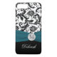 Monogrammed modern black and white floral damask pattern Case-Mate iPhone 7 Case with teal blue PRINTED ribbon and PRINTED faux engraved look crystal brooch. Customise it to add your name, initial, or other text. If you need assistance, email niteowlstudio@gmail.com.