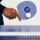 This item features an abstract blue and white geometric pattern and space for your initial.