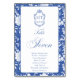 Delft blue floral table number card, designed in a refined blend of chinoiserie and French toile de Jouy style. The soft botanical illustrations frame an arched layout featuring an elegant wedding crest monogram, perfect for couples who love vintage, historic, and European-inspired aesthetics. Classic script typography pairs beautifully with the ceramic-blue palette, making this design an effortless nod to the tradition of “something blue.” Fully customizable with your guest's names, wedding crest and in this design table number: Seven, it’s an exquisite choice for any romantic or sophisticated wedding theme.
