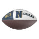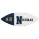 This is a full size football with one panel designed with a monogram name (large first letter) and uniform number, in popular college colours. This one is shown in blue and a metallic-look gold. The football is also available with two white panels so that a 2nd panel may include designs or room for signatures.