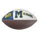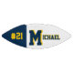 This is a full size football with one panel designed with a monogram name (large first letter) and uniform number, in popular college colours. This one is shown in blue and gold (maze). The football is also available with two white panels so that a 2nd panel may include designs or room for signatures.