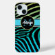This modern and chic black zebra striped iPhone 15 case has a background colour gradient from yellow to green to turquoise with a turquoise, black, and white band across the middle with a black and green circle on top that has template text for you to personalise with your name in white over your monogram or initial in turquoise. It's perfect for the fun-loving young woman with a style all her own. If you need assistance, email niteowlstudio@gmail.com.