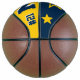 This is a full size basketball with two panels designed with a monogram name (large first letter) and uniform number, in popular college colours. This one is shown in blue and maze. The second panel has team colours with three stars. All text, art, and colours can be removed, or changed as desired. One panel can be left white for autographs, etc.