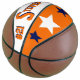 This is a full size basketball with two panels designed with a monogram name (large first letter) and uniform number, in popular college colours. This one is shown in Blue, Orange, and White. The second panel has team colours with three stars. All text, art, and colours can be removed, or changed as desired. One panel can be left white for autographs, etc.