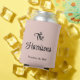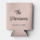 Blush pink monogram wedding can cooler party favour with your married last name in a stylish script on one side, and your first names inside a heart wreath on the other side.