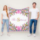 Boho Fleece Blanket with floral / foliage monogram. Whimsical сolorful branch with purple, blue, pink, golden, green leaves and pink hibiscus flowers. Golden monogram + purple name. Purple border. A great personalised gift.
