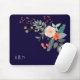 A colourful spray of graphic botanical flowers decorate this mousepad and it can be personalised with three monogram initials. The background is a rich navy blue.