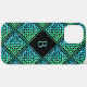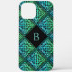 A black monogram iPhone 12 Pro Max Case with a blue-green Celtic knot repeated diamond tile design. Make it personally yours with your very own monogram.