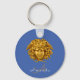 This customisable keychain design with a French blue background features a chic monogrammed copy of a golden medusa mask originally created with gilded bronze in France circa 1875 and at one time owned by famed ultra rich financier John Pierpont Morgan. The original piece is in the permanent collection of the Metropolitan Museum in Manhattan. According to ancient Greek mythology, Medusa, also referred to as Gorgo, was one of the three terrible magical Gorgons, usually depicted as winged humanoid females with live poisonous serpents in place of the hair on their heads. Allegedly anyone who looked into Medusa's eyes was turned into stone. You can easily change the background colour, text spelling; font style, colour and size with the Zazzle Personalise and Edit buttons.