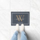 Chic, modern Dark Blue monogrammed doormat with your names and year established in white elegant hand lettered script calligraphy on a Dark Blue background with a gold monogram. Simply add your names, monogram and year established beneath. Stylish design and perfect luxury gift for the newlywed couple.