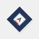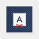 Stylish monogrammed napkins featuring a blue bordered square with a red ribbon against a blue and white polka dot pattern. Great for a variety of events such as a bridal shower, baby shower, weddings etc.