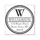 A classic circular personalised self-inking stamp design featuring a double circle border with elegant monogram initial, name and return address text.