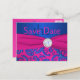 ****PLEASE NOTE that the ribbon and jewels are printed images, and are not real. This monogrammed cobalt blue and fuchsia pink floral damask save the date post card matches the wedding invitation shown below. If you require any changes, or want additional matching items, email niteowlstudio@gmail.com with your request.