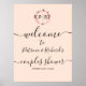A simple chic foliage rose gold foil monogram peach rose couples shower welcome sign foam board. Easy to personalise with your details. Modern boho couples shower welcome sign foam board editable, customisable, calligraphy handwritten font, simple, elegant.