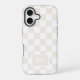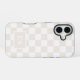 Stylish iPhone case features a neutral cream and white chequered pattern with a customisable monogram in a beige rectangle near the bottom. Add your initials in the sidebar to personalise it. The geometric chequerboard pattern is made of rows of alternating white and light tan squares. Other case styles and models are available in the sidebar.
