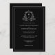 Formal monogram crest wedding invitation with white text on a classy black background.