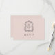 This elegant wedding RSVP card features a pair of charcoal grey monogram initials framed by an acanthus leaf wreath crest on a blush pink background. The text combines open serif and classic sans serif fonts.