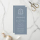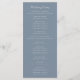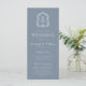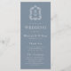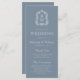 This elegant vintage-inspired wedding program features a pair of white monogram initials in open serif font above and below a dividing line and encircled by a line art botanical crest on a dusty blue background.