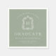 This classic, elegant graduation party napkin design features a white monogram initial in open serif font encircled by a vintage line art acanthus crest on a sage green background. Personalise the text with the graduate's name, school and class year. Ideal for high school or college graduation.