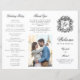 These trifold wedding programs come as a flat sheet of paper to be manually folded. The elegant monogram crest has the initials of the bride and groom in fancy script font on the front. The programs are perfect for long ceremonies, with the order of ceremonies on the three inside flaps. The outside has the wedding party, thank you note, and a photo of the happy couple.