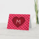 This card features a pattern of repeating red hearts overladid by a large crimson heart containing a monogram initial. The card is blank inside - awaiting your personalised note or custom text.